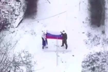 Российский военный в костюме Деда Мороза развернул триколор в Димитрове